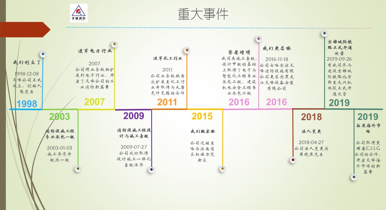 黑龍江天峰設(shè)備安裝有限公司(以下簡稱:天峰消防)創(chuàng)立于1998年,主要承接能源化工、石化、電力、軌道交通、冶金、城市管廊等工業(yè)行業(yè)消防系統(tǒng)工程,可為客戶提供特殊消防系統(tǒng)的詳細(xì)設(shè)計(jì)、供貨、施工等集成服務(wù),天峰消防將依靠自身實(shí)力和信譽(yù)實(shí)現(xiàn)“立足龍江,布局全國,走向海外”的目標(biāo)。